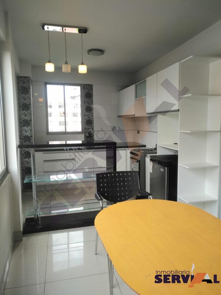 340 $us.- Bonito garzonier amoblado en inmediaciones de Burguer King, próximo Av. Ayacucho, consta de: 1 dormitorio con ropero empotrado, Escritorio, baño con Tina, Living-comedor, cocina americana barra de bar. (Cod:GA166)